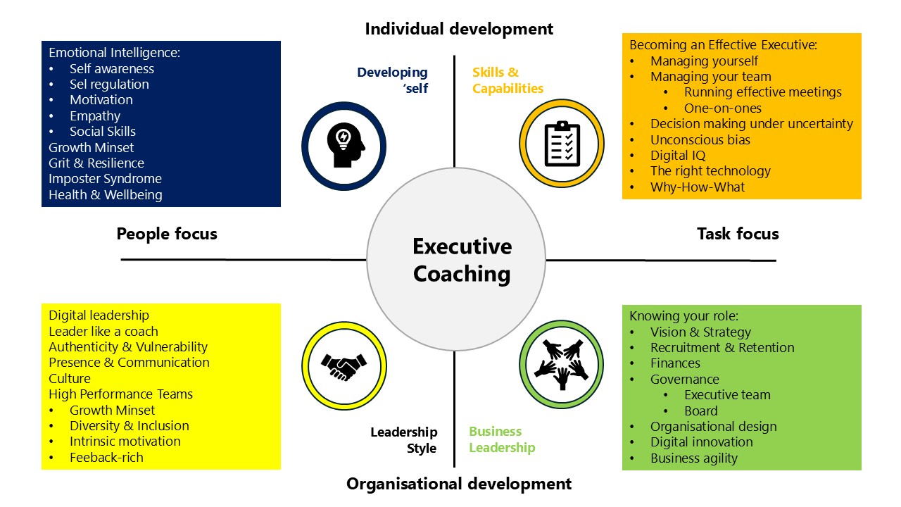 Ready to elevate your leadership skills? Our Executive Coaching service provides personalized guidance to help you achieve your professional goals and maximize your impact.